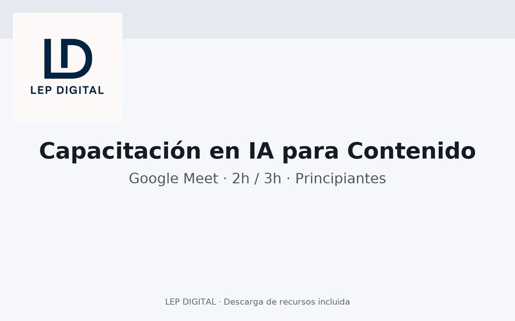 Capacitación práctica de IA para contenido (prompts + talleres en vivo). Google Meet, 2h o 3h. Incluye PDF y soporte.